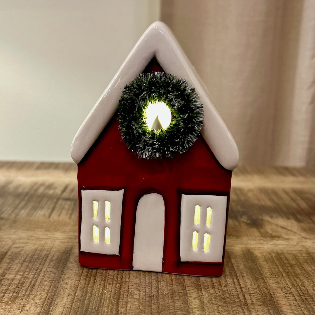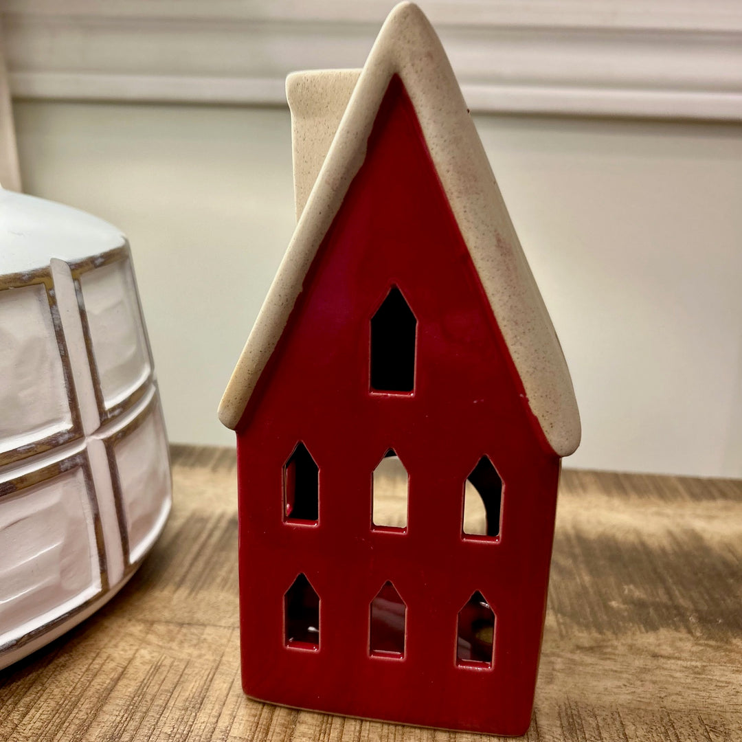 TALL RED CERAMIC HOUSE TEALITE HOLDER